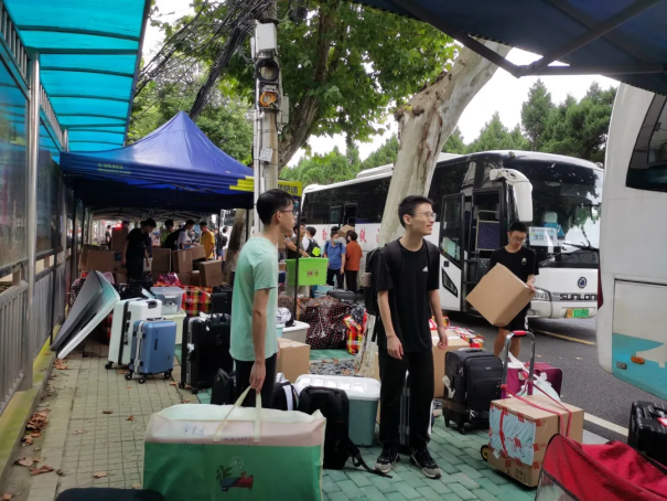 在搬迁过程中,班主任老师陈麒玉、康晓军、王群星、龚文引、姜鑫维、朱静、樊俊青、刘超、王媛妮、曹弘、刘然、陈晓宇、彭建怡在南望山校区组织同学们搬迁上车,黄燕霞老师在未来城校区做好接车安排全体辅导员各司其职,与同学们一起战斗在搬迁工作第一线。早上7:40,第一批次的车辆装车完成,顺利驶向未来城校区。