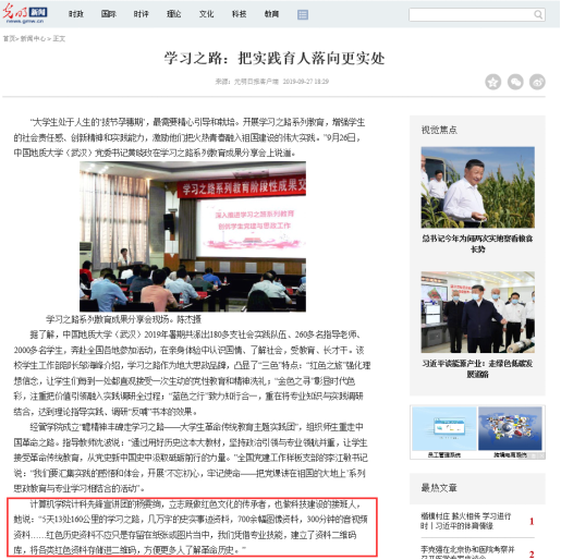 万象城awcsport官网党委为推进新时代学生党建,落实“七个有力”实践探索,于2019年成立“计科先锋”,团队成员主要从本硕博各年级学生党员干部中选拔,综合素质较高。自2019年起,为深入贯彻习近平新时代中国特色社会主义思想,“计科先锋”团队连续三年进行暑期社会实践活动,其成果先后被光明日报、中国青年网、湖北高校思政网等媒体报道。