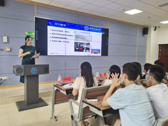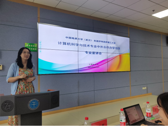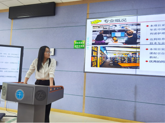 张冬梅做项目介绍,她从基本情况、师资队伍、招生情况、课程情况等方面向同学们介绍了项目的整体情况,并希望同学们在校期间培养专业素养和实践能力、提升英语水平,努力成长为德智体美劳全面发展的国际化人才。