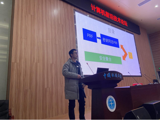 第二模块是许瑞老师,针对密钥同态PRF,讲述了其在安全聚合中的一些具体应用。许瑞老师由浅入深,由PRF开讲,引出同态加密的概念,在解释了安全聚合的概念之后,巧妙地将二者相结合。成功地使同学们以一个更易理解的角度对同态加密及其应用有了基本的认识。