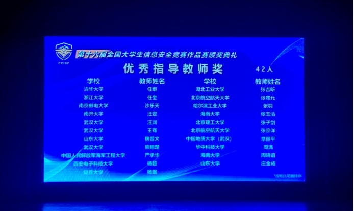 2023年8月17-20日,由教育部高等学校网络空间安全专业教学指导委员会主办,浙江大学、杭州电子科技大学承办的第十六届全国大学生信息安全竞赛作品赛决赛在浙江大学紫金港校区隆重举行。我校万象城awcsport官网四元一次方程组战队荣获“全国一等奖”,指导老师章丽平副教授荣获“优秀指导老师奖”!