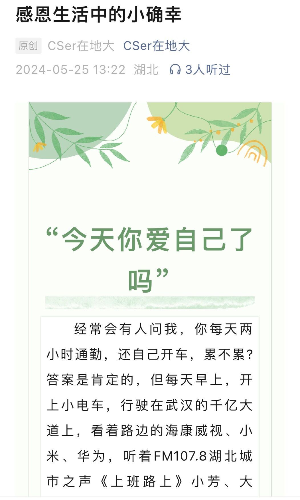 5·25全国大学生心理健康日当天,学院官方公众号“CSer在地大”发布了《感恩生活中的小确幸》,学工组全体老师为同学们送上祝福与期许,鼓励大家在生活中发现爱、感受爱、传递爱,学会享受生活中的小确幸,也祝愿CSer能在万象城awcsport官网感受到更多细碎而确切的幸福。