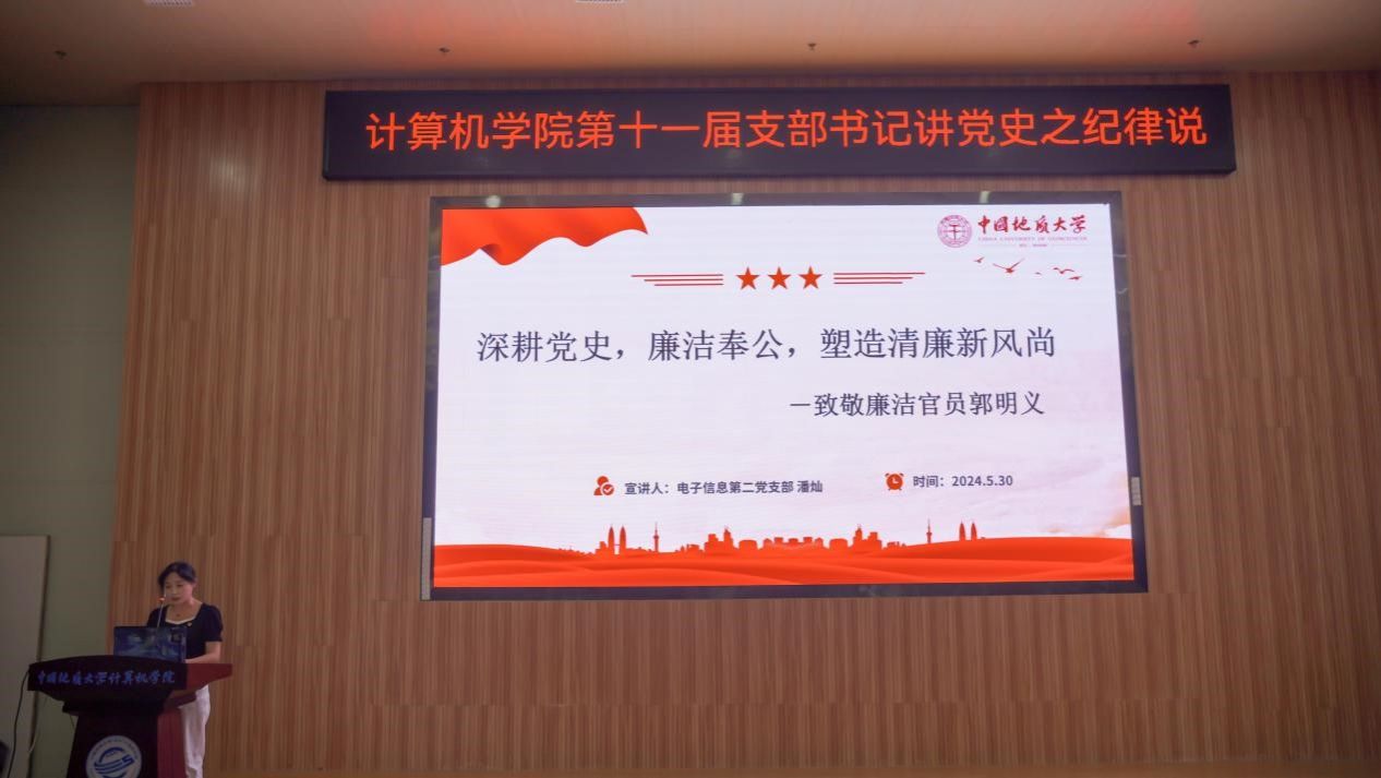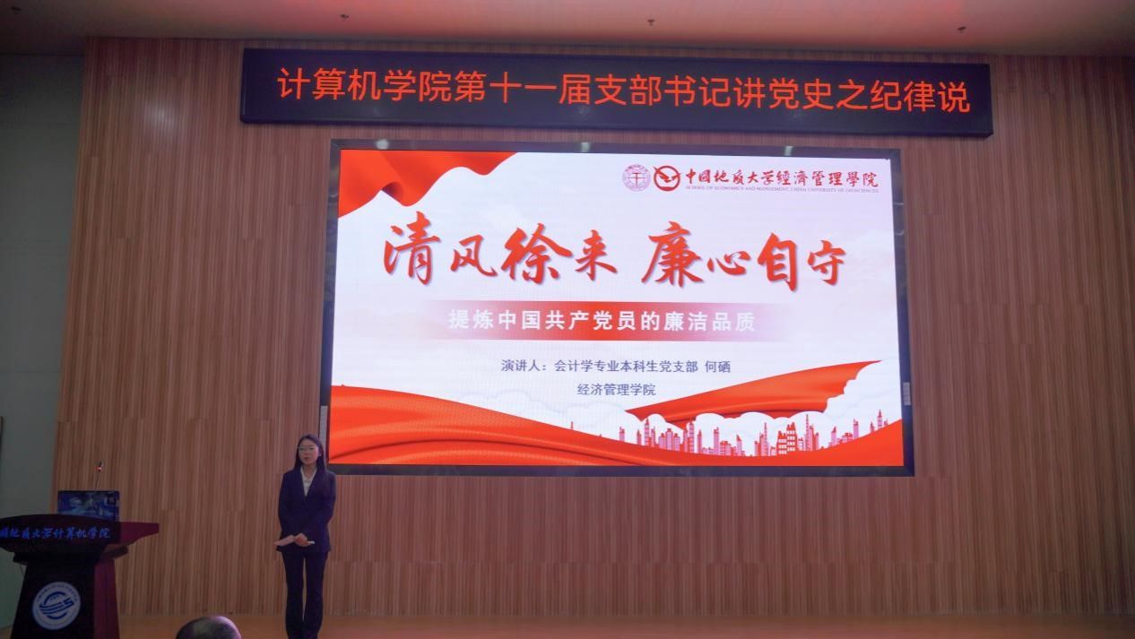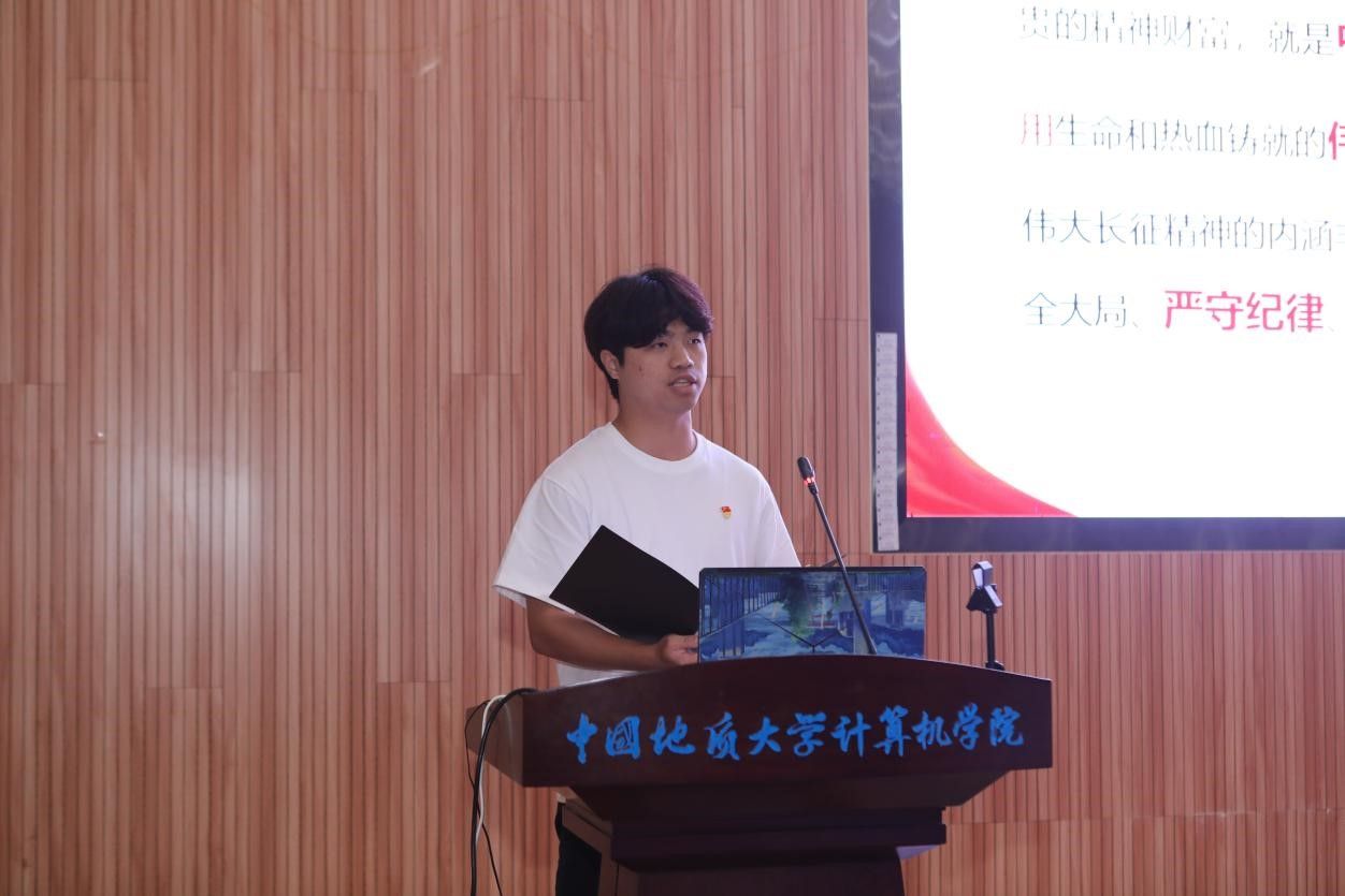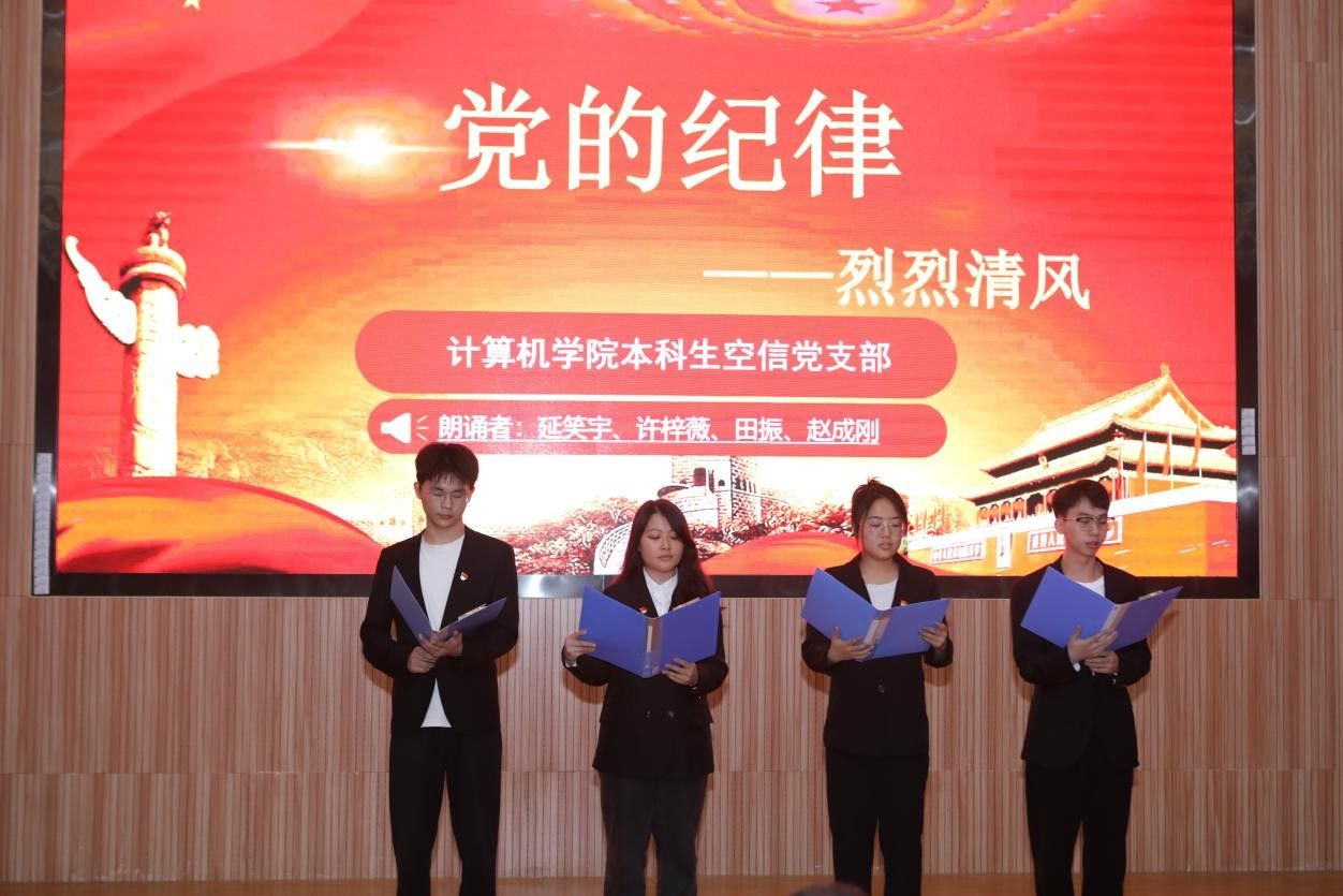 活动在雄壮的国歌声中拉开帷幕。学生党支部书记率先登场。电子信息第三党支部朱国强以刘邓大军的严明军纪为例,强调了纪律在军队建设中的重要作用。本科生信安党支部郭鹏顺则从新民主主义革命时期的党纪建设出发,强调了坚守初心、严明纪律的意义。本科生空信党支部延笑宇等多名成员以“党的纪律:烈烈清风”为题的诗歌朗诵,声情并茂地展现出对党廉政建设的歌颂。本科生计科第一党支部王诗敏则以延安廉政的故事为蓝本,深入剖析了党在推动廉政反腐方面的必要性和坚定决心。电子信息第二党支部潘灿通过讲述郭明义的故事,展现了廉洁奉公、无私奉献的崇高精神。电子信息第一党支部胡长浩深刻阐述了铁纪在长征这一伟大的历史事件中的关键作用。在万象城awcsport官网空间信息工程党支部与经济管理学院生态文明研究生样板党支部成员的精心编排下,以一场独具特色的话剧将现场气氛推向了高潮,生动诠释了“亲民爱民、艰苦奋斗、科学求实、迎难而上、无私奉献”的“焦裕禄精神”。