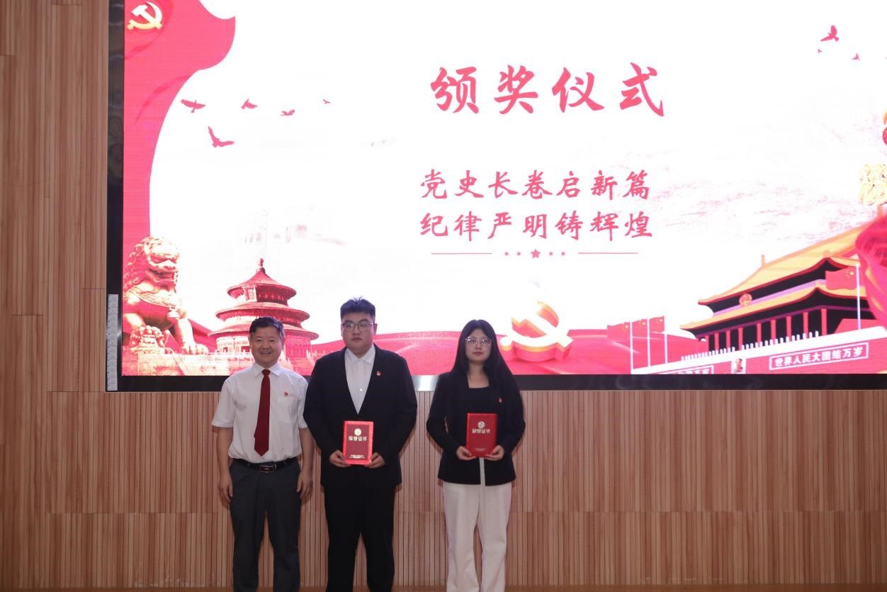 在示范党课环节,马钊老师以《清风徐来,廉洁花开》为题,深入浅出地阐述了廉洁自律的重要性,引导大家从现在做起,从身边小事做起,从遵守考试纪律、坚持推优评奖原则等日常学习工作生活做起,扣好廉洁自律“第一粒纽扣”。校友代表肖飞龙以《始终坚持严的基调 全面加强纪律建设》为题,带领大家深刻学习领悟习近平总书记关于党的自我革命的重要思想。李国昌书记原原本本领学了《中国共产党纪律处分条例》中关于政绩观的修订内容,分享了习近平总书记在延安梁家河、河北正定等地工作期间造福人民的故事,希望青年学生自觉学习党规党纪,切实践行造福人民的政绩观,并在新时代的新征程上不断建立新功。示范党课结束后举行了隆重的颁奖仪式。