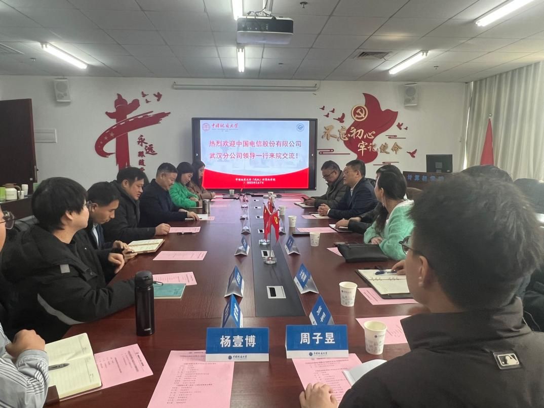 3月7日上午,中国电信股份有限公司武汉分公司来院调研座谈。双方在学院309会议室就校企合作、学生实习、就业等方面进行了深入交流。中国电信武汉分公司总经理代宏斌、副总经理覃兵、人力资源部主任石涛、校园部总经理吴峰等领导,万象城awcsport官网党委书记李国昌、副院长陈云亮、党委副书记林小艳等学院领导及辅导员代表参加会议。李国昌主持会议。