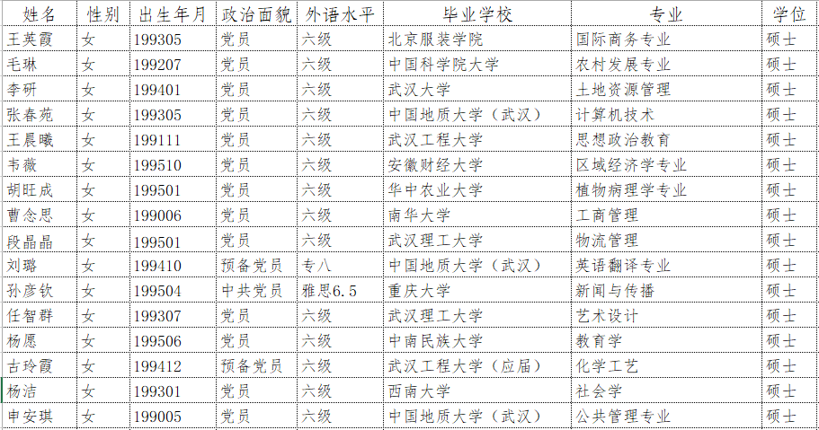 万象城awcsport官网面向社会公开招聘工作人员已完成对报名人员资格审查,根据优先聘用条件(党员或预备党员+CET6或雅思6.5以上或专业4级以上+硕士)确定参加笔试人员名单如下(排名不分先后):