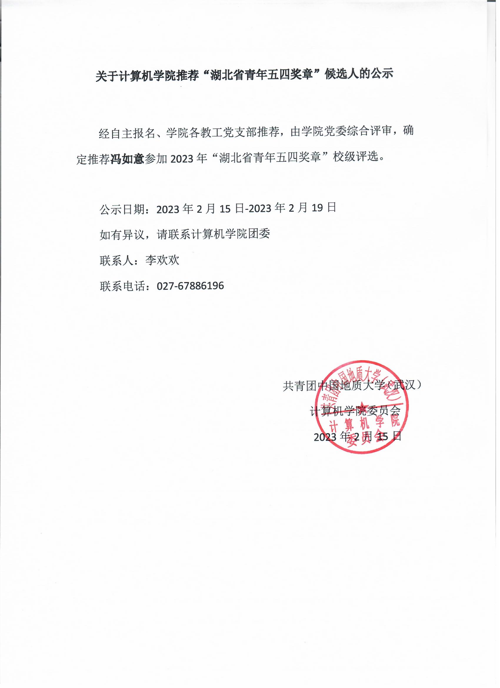 关于万象城awcsport官网推荐“湖北省青年五四奖章”候选人的公示