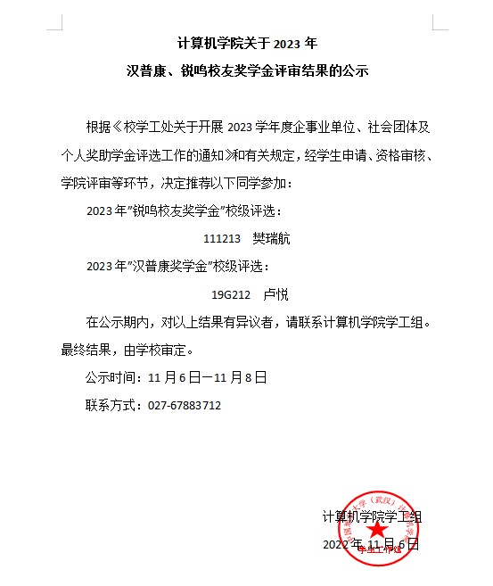 万象城awcsport官网关于2023学年汉普康、锐鸣校友奖学金评审结果的公示