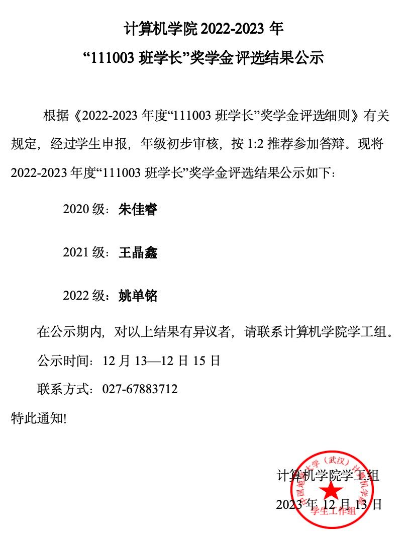 万象城awcsport官网2022-2023年 “111003班学长”奖学金评选结果公示