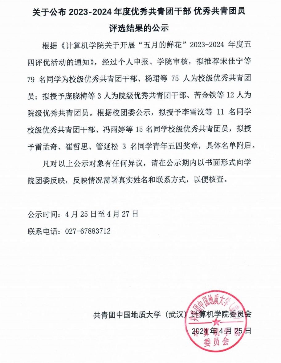 关于公布2023-2024年度优秀共青团干部、优秀共青团员评选结果的公示