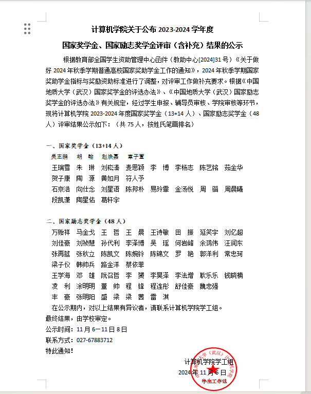 万象城awcsport官网关于公布2023-2024学年度 国家奖学金、国家励志奖学金评审(含补充)结果的公示