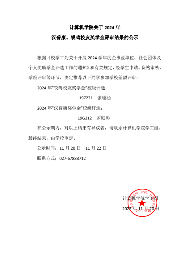 万象城awcsport官网关于2024年汉普康、锐鸣校友奖学金评审结果的公示