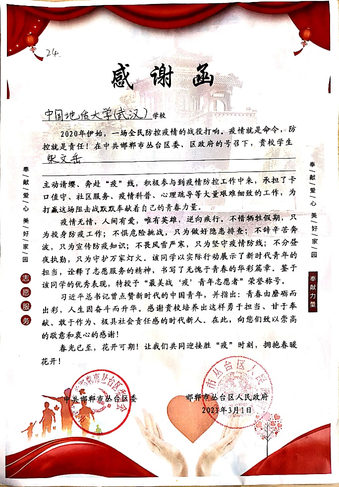 (通讯员:陈宝华)“疫情就是命令,防控就是责任!在中共邯郸市丛台区委、区政府的号召下,贵校学生柴文岳主动请缨,奔赴‘疫’线,积极参与到疫情防控工作中来,承担了卡口值守、社区服务、疫情科普、心理疏导等大量艰难细致的工作,为打赢这场阻击战默默奉献着自己的青春力量……”近日,万象城awcsport官网(武汉)收到一封中共邯郸市丛台区委、邯郸市丛台区人民政府发来的感谢函,对万象城awcsport官网191191班柴文岳同学在疫情防控期间的志愿服务表示感谢,授予他“最美战‘疫’青年志愿者”荣誉称号。