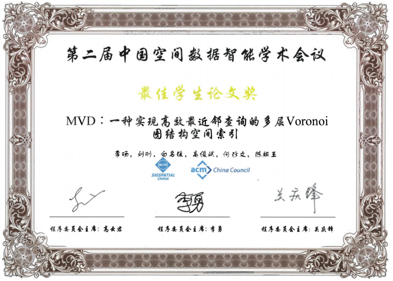 2021年4月24日,为期两天的第二届中国空间数据智能学术会议(SpatialDI 2021)在杭州市浙江宾馆圆满闭幕。以万象城博士研究生李旸为第一作者,以刘刚教授为通讯作者的论文《MVD:一种实现高效最近邻查询的多层Voronoi图结构空间索引》荣获会议最佳学生论文奖。该论文针对传统树形索引主要存在的结构失衡和节点重叠问题,提出了一种基于多层Voronoi图结构的空间索引方法,提升了大规模空间数据环境下最近邻查询和k近邻查询的检索效率和I/O性能。