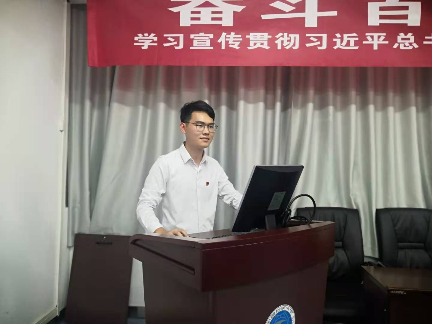 接下来由学生党员代表发言。来自本科生计科第一党支部的计强同志表达了自己作为一名党员的荣幸与自豪,对身边优秀党员无私奉献的精神致以崇高的敬意。他时刻提醒自己要努力学习,奋发拼搏,用自己的专业知识为祖国的繁荣富强贡献力量。