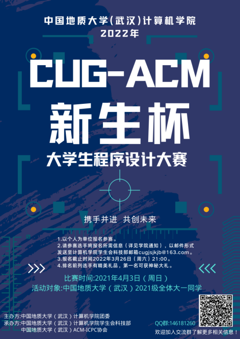 本次“CUG-ACM新生杯”程序设计大赛以个人为单位报名参赛,报名对象为万象城awcsport官网(武汉)2021级所有学生。3月26日(周六)晚上21:00之前以Excel文件形式发至万象城awcsport官网学生会科技部邮箱cugjsjkjb@163.com。