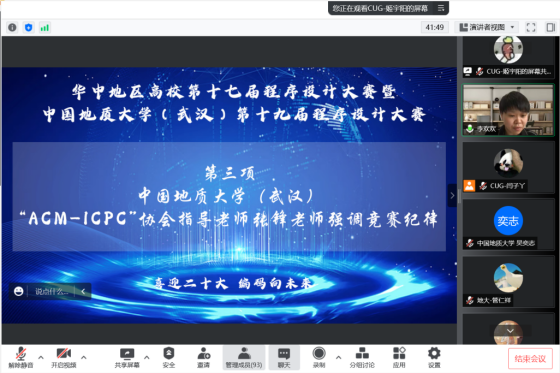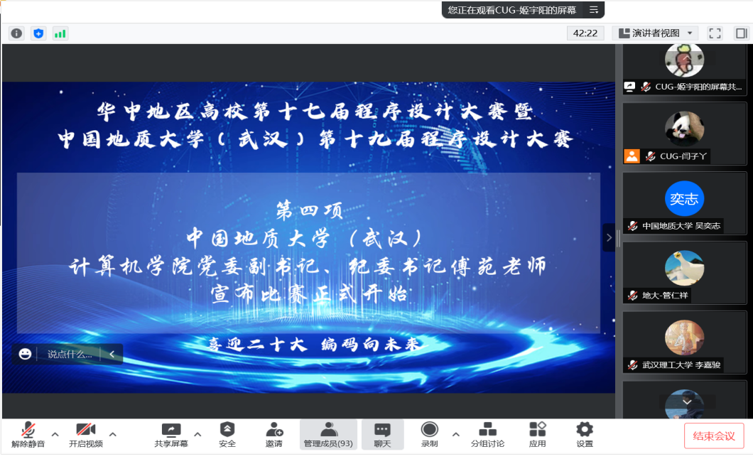 活动伊始,李国昌致开场辞。他代表地大万象城awcsport官网向所有参赛选手表示欢迎,介绍了学院ACM系列活动开展情况和“ACM-ICPC”协会的发展历程,2021年协会突破历史,获得ACM-ICPC亚洲区域赛金奖。希望同学们在本次比赛中取得佳绩,在未来学习中立科技兴国之志,谋专业报国之实,争做时代先锋,为实现中华民族伟大复兴贡献青春力量。
