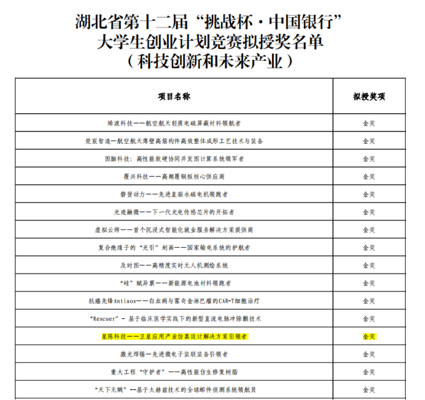 由研究生崔祥森、杨博、顾伟超、张磊、雷培迪、马瑞华,博士生余倩倩,本科生李嘉欣组成的“星陈科技”团队,立足学科专业特色,专注航天仿真领域,传承实验室师徒四代人的国产自强航天梦,打造“卫星+通导遥多领域”应用产品仿真平台,利用完全自主知识产权产品及解决方案为中国航天产业加速商业化贡献“星陈力量”。团队在戴光明、王茂才等老师的悉心指导下,经过学校初赛、复赛和决赛的筛选打磨,不断优化完善,最终在湖北省挑战杯赛事中斩获金奖。