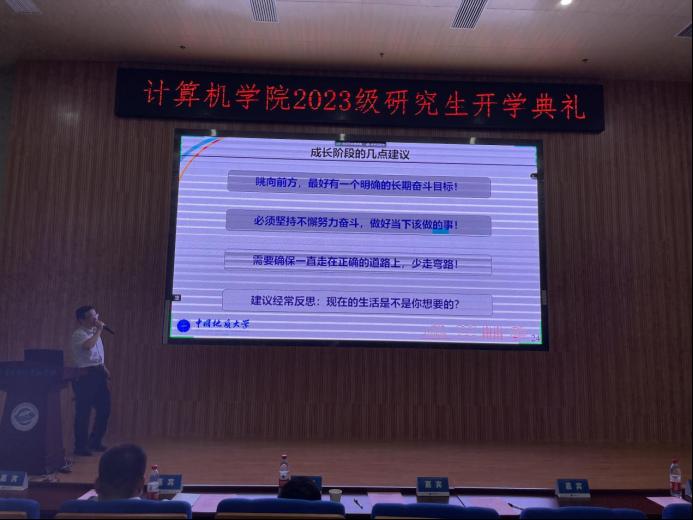 张院长首先肯定了同学们为考研付出的努力,对2023级研究生的到来表示热烈的欢迎。他以学校发展历史与人才培养成绩为切入点,向同学们展示了学校丰厚的底蕴,并从专业设置、师资队伍、科研平台与科研项目等方面介绍了学院近年来发展的概况。他谈到,国家在高新领域的巨大投入以及良好的政策指引,学校深厚的学术科研底蕴和一代代地大人的砥砺奋斗,为今天的在座的同学们奠定了良好的成长环境和优渥的发展平台,希望同学们秉承“艰苦朴素,求真务实”的校训精神,在地大万象城awcsport官网刻苦钻研,实现出属于自己的新突破,为国家前沿科技发展贡献自己的力量!