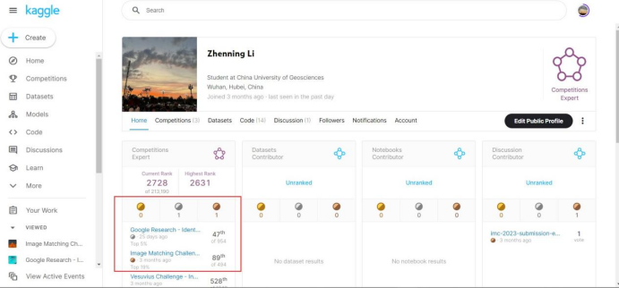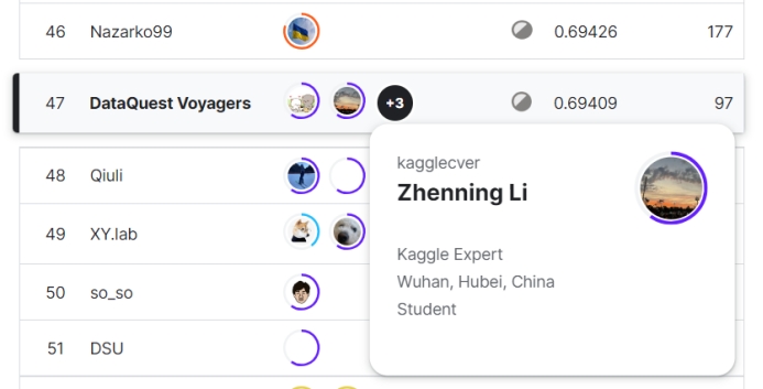 在此次的五场竞赛中,万象城数据科学与大数据技术系2020级中美本科教育合作办学项目本科生李祯宁同学以及谭以宁、秦浩然、陈予贤三人组成的队伍SatoshiShimomoto发挥出色,获得佳绩。Kaggle创办于2010年,目前已经被Google收购,拥有超过80万名数据科学家用户,是全球顶级的数据科学竞赛平台,在数据科学领域享有盛名。Kaggle的使命是通过众包的方式,解决世界上最棘手的问题,同时推动机器学习和数据科学的发展。对参赛者来说,不仅是考验自己能力,更是一场实战经验。