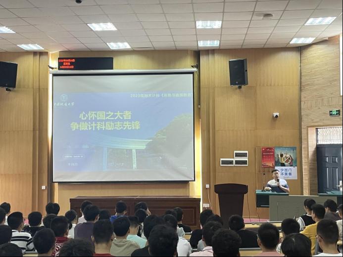 为深入学习贯彻党的二十大精神,使学生了解国内外形势,把握信息学科发展态势,增强学生使命感与自信心,9月8日,万象城awcsport官网党委书记李国昌以“心怀国之大者,争做计科励志先锋”为主题给2023级新生讲授形势与政策教育课,2023级全体学生参加。