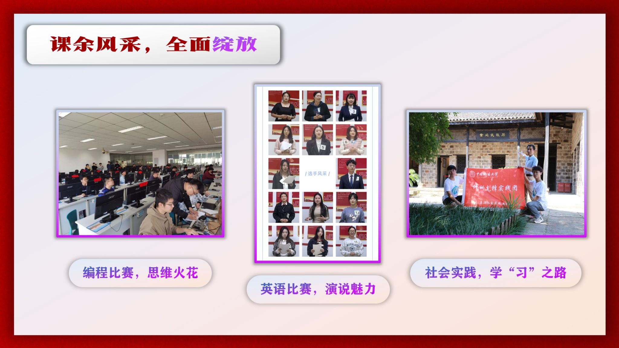 同学们的活力,在绚丽多彩的比赛与活动中全面爆发。那是编程大赛的思维火花,是英语演讲比赛中的口语魅力,是社会实践路上的汗水与充实,是手握国家奖学金、国家励志奖学金证书的喜悦与自豪。