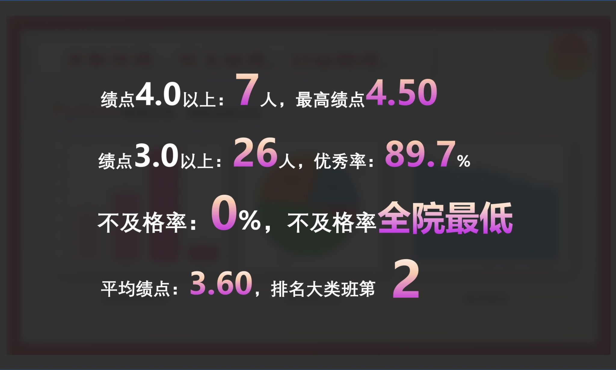 191212班大二春季学期绩点4.0以上7人,绩点3.0以上26人,最高绩点4.5;平均学分绩点排名学院大类班第二;挂科率为零,位列学院第一。