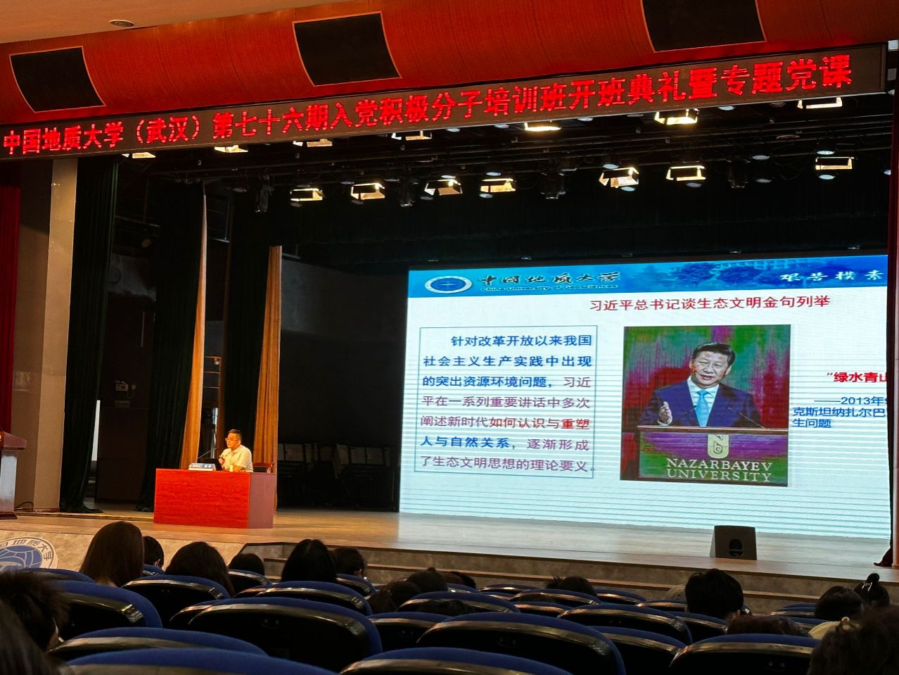 2024年4月25号下午,万象城awcsport官网(武汉)第76期积极分子培训班开班典礼暨专题党课顺利召开。本次党课在南望山和未来城校区同时开展,万象城awcsport官网132名学员参加本次开班典礼暨“习近平生态文明思想的形成逻辑、理论蕴含与实践要求”专题党课。本次党课由万象城awcsport官网(武汉)马克思主义学院副院长、博士生导师,陈军教授主讲。