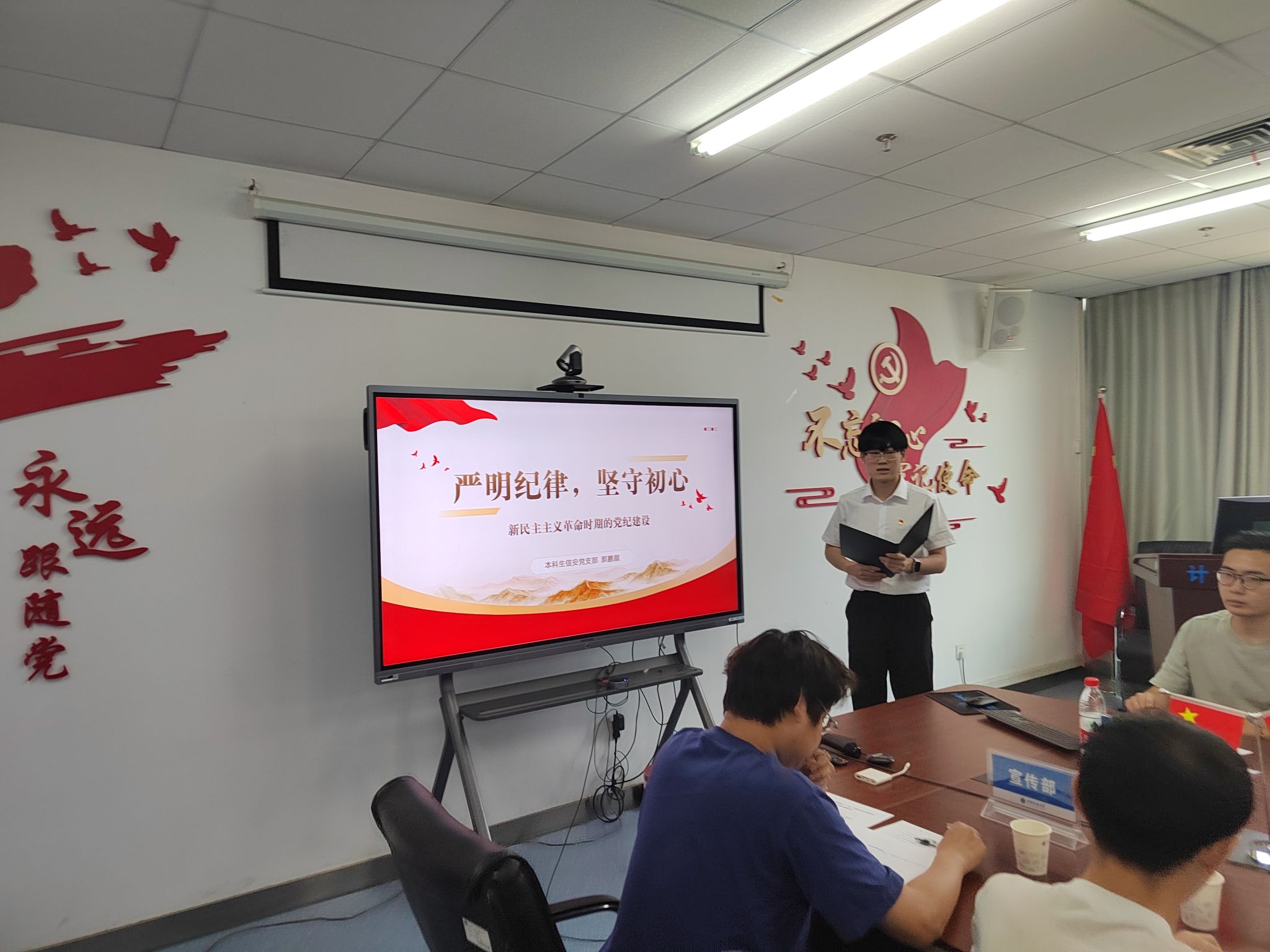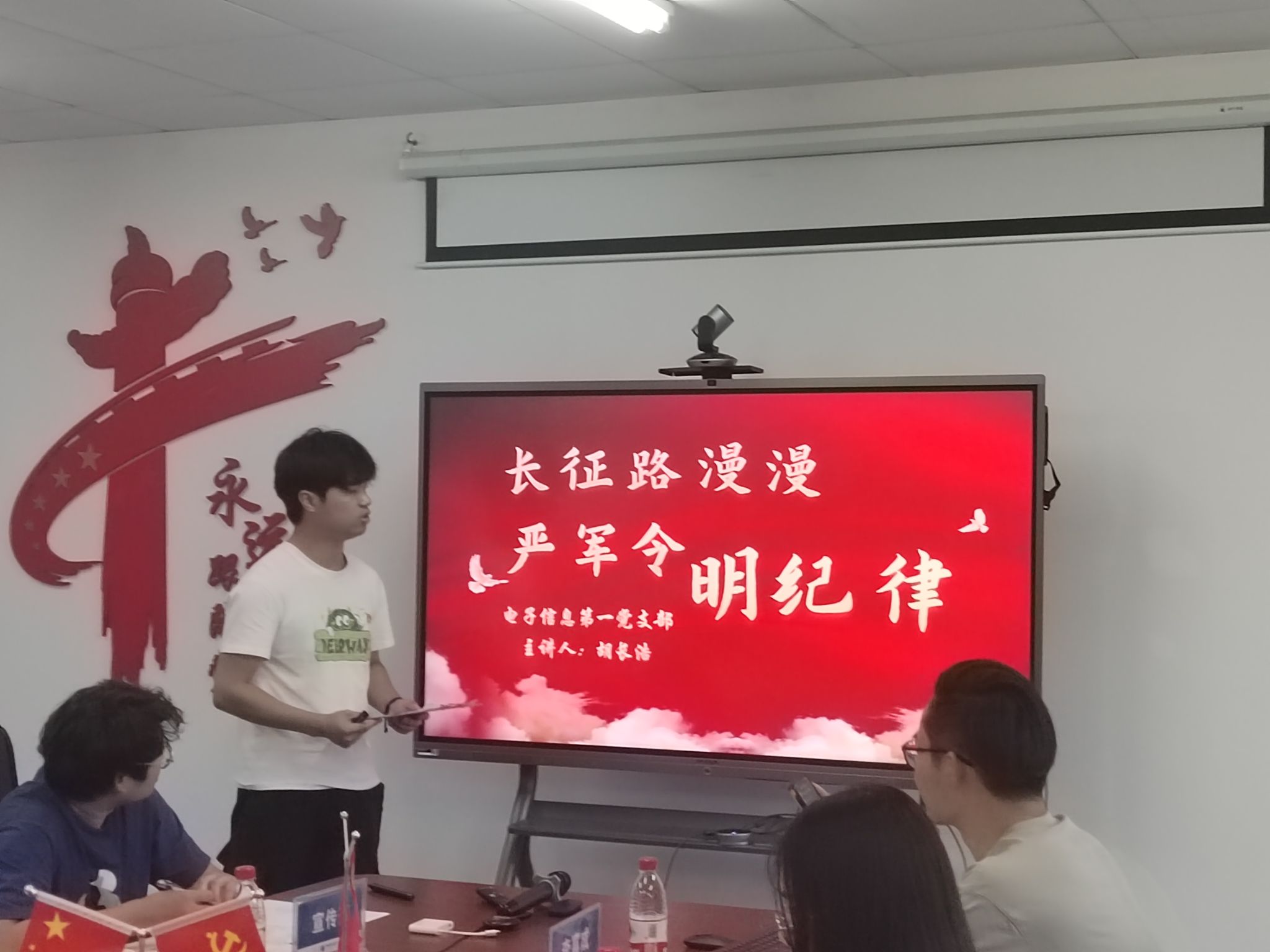 本科生空信党支部多名成员进行了诗歌朗诵,以“党的纪律:烈烈清风”为题,声情并茂地展现出对党廉政建设的歌颂。本科生智科党支部郭绪浩以周恩来廉洁奉公、严以律己的故事,让人深入了解中国共产党的历史、思想和精神传承。电子信息第二党支部潘灿也讲述了郭明义的故事来展现廉洁奉公和无私奉献精神。本科生计科第一党支部王诗敏以延安廉政的故事,展现党对于推动廉政反腐的必要与决心。电子信息第一党支部胡长浩以长征时在艰难困苦中取得胜利,体现出铁纪的重要性。