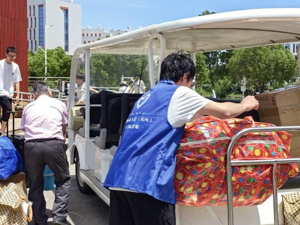 大巴驶入校园,在同学们即将入住的宿舍前,橙色的遮阳棚早已搭好,身穿蓝色马甲的志愿者们静候多时。多辆搬运车辆将学生行李送到宿舍楼下,老师和志愿者们积极帮助2024级计科学子们搬运行李,引导方向;宿管阿姨给大家发放钥匙,认真细致地登记信息;同学们团结协作,将一件件沉重的行李搬进新宿舍,开启一段全新的学习与生活旅程。