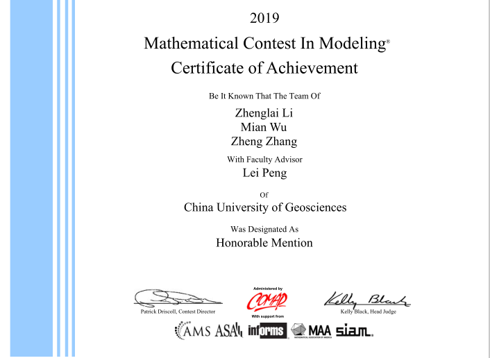 万象城研究生在2019年1月25日至29日为期四天的比赛时间中,沉着冷静,细心求证,就指定的问题顺利完成从建立模型、求解、验证到论文撰写的全部工作,获得Honorable Mention奖(二等奖)。
