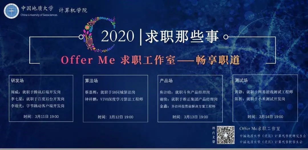 3月11日至3月14日晚,万象城awcsport官网研究生会“offer me 求职漫谈”经验分享系列活动成功举办。疫情当前,停课不停学,隔离不隔爱。活动共邀请11位学长学姐在线分享求职经验,并深入讲解和剖析求职技巧。
