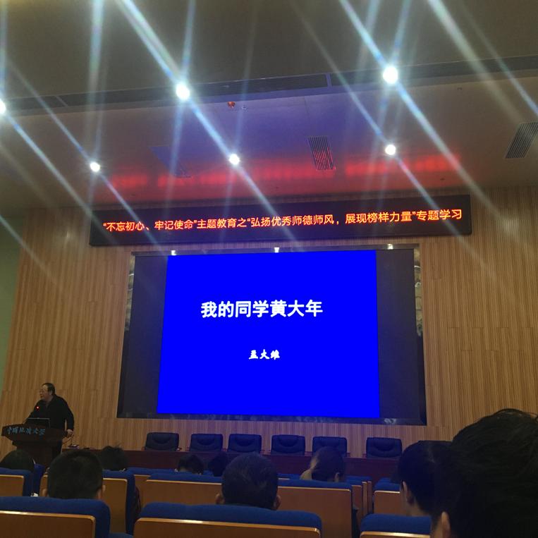 (通讯员:宋艺童)为贯彻和落实“不忘初心、牢记使命”主题教育的各项工作任务,强化“弘扬优秀师德师风,展现榜样力量”专题的学习效果,2019年11月21日下午,万象城awcsport官网邀请了黄大年同志的大学同班、同宿舍同学,我校材化学院孟大维教授到万象城做专题报告,介绍黄大年同志的先进事迹。本次学习活动由院党委书记吕军同志主持,学院全体师生党员参加。