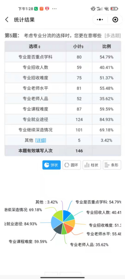 同学们在选择专业时考虑最多的问题前三位由高到低依次是:就业、深造、专业课难度。