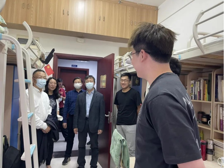 唐忠阳一行首先查看了老兵宿舍的住宿条件,对宿舍的内务卫生提出了表扬,表示大学生的内务卫生是老师们都关心的问题,希望同学们继续保持良好的作风,同时带动周围其他同学形成良好习惯。唐忠阳仔细询问了每一位同学的职业规划,并对大家继续深造和考公的规划进行了深入了解。最后勉励同学们要继续保持退伍军人的志气和本色,不管走到哪都不要忘记“根在地大”,踔厉奋发,为祖国发展贡献地大力量!