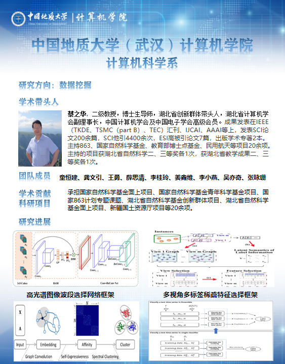 主要开展机器学习、演化算法及其智能调度应用、人工智能及其应用、高光谱图像处理等方面的科研工作。共有专任教师10人,其中学术带头人1人,学术骨干3人。主持的项目获湖北省自然科学二、三等奖各1次,获湖北省教学成果二、三等奖各1次。承担国家自然科学基金面上项目、国家自然科学基金青年科学基金项目、国家863计划专题课题、湖北省自然科学基金创新群体项目、湖北省自然科学基金面上项目、新疆国土资源厅项目等20余项。