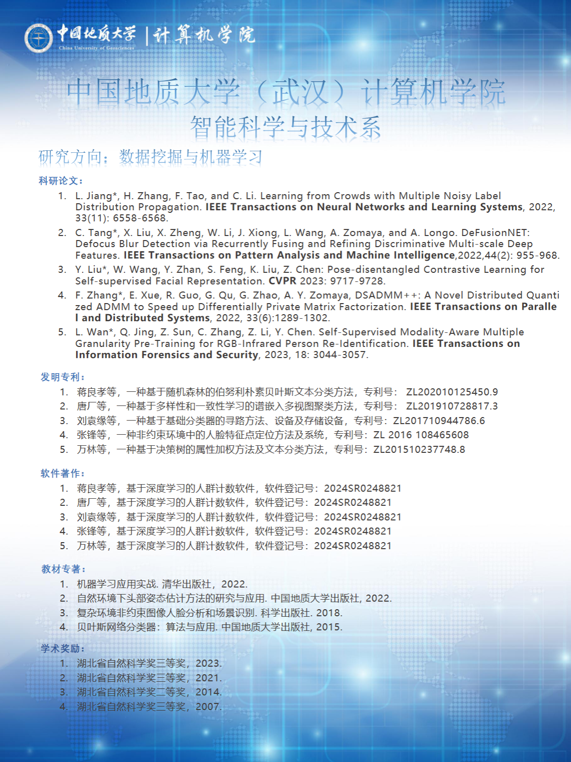 万象城awcsport官网蒋良孝教授领导的团队在数据挖掘与机器学习理论及其应用研究领域连续获得国家自然科学基金项目、湖北省自然科学基金重点项目、湖北省揭榜制重大科技项目等资助,自主研发数据挖掘与机器学习系列理论及其应用创新成果,在著名学术刊物及国际会议上发表论文300余篇,拥有发明专利30余项,软件著作权20余项,出版教材专著4部,荣获湖北省自然科学奖二等奖等7项奖励。