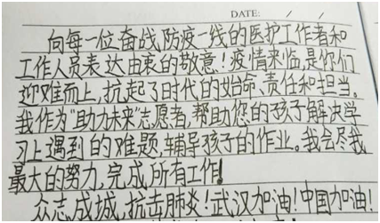 由于新冠肺炎疫情发展的需要,全国各地的医护人员不畏艰苦,远离温暖的小家,为了更好的大家,勇赴武汉抗疫一线,当在电视上看到这一支支出发的医护队伍时,我感到非常的感动和激动。我希望我也能够为这次疫情尽一份绵薄之力。当我得知学院在招募为医疗人员的子女辅导学习的志愿者时,我想我该做点什么了。感谢学校组织这一次志愿活动,让我虽在远方也能尽一分力,希望疫情尽快结束。