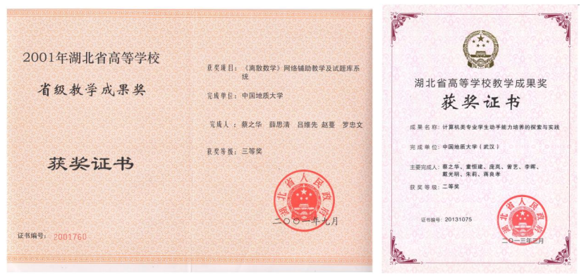 自1986年任教以来,蔡之华老师长期主讲本科生课程和研究生课程,包括数据结构、离散数学、机器学习、计算机应用数学,承担过本科生学务指导老师和班主任工作。他任班主任的班级曾荣获“湖北省优秀班集体”。他非常重视课堂教学,常对学生说:“高效的课堂学习是培养学科兴趣的动力。”蔡老师“组合数学”(学生们习惯称呼,实为“计算机应用数学”)经常板书推导公式,给学生留下了深刻印象。他带领教学团队,积极探索新教学模式,延展课堂教学空域和时域,优化教学交互过程,提升教学质量。他带领的教研团队多次获得湖北省、学校教学成果奖,主持的教研项目获湖北省人民政府二、三等奖各1项,公开发表教研论文5篇,编写教材3部,其中一部获得万象城awcsport官网普通高校优秀教材一等奖。他是国家一流本科专业“计算机科学与技术”建设点的负责人。