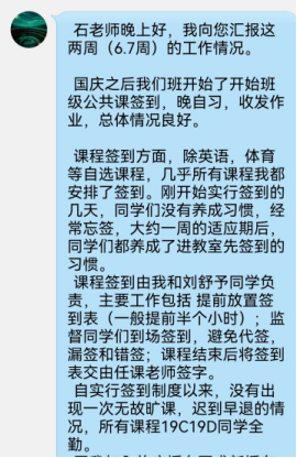 石剑峰2019年起担任191193班班主任(专业分流前为19C19D班)。他围绕以学习为核心的班级建设方向,指导班级制定并严格执行了全空间时间全链条的学习制度,打造了班级学习共同体,助力同学们学业有成。