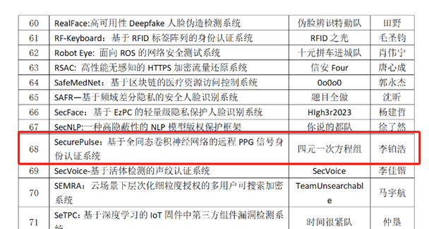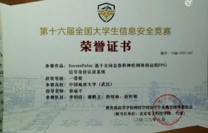 第十六届全国大学生信息安全竞赛落下帷幕,四元一次方程组战队在众多双一流高校的队伍中脱颖而出,“SecurePulse:基于全同态卷积神经网络的远程PPG信号身份认证系统”斩获全国一等奖!