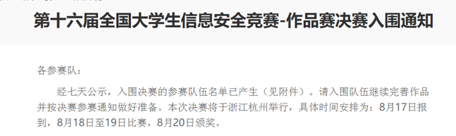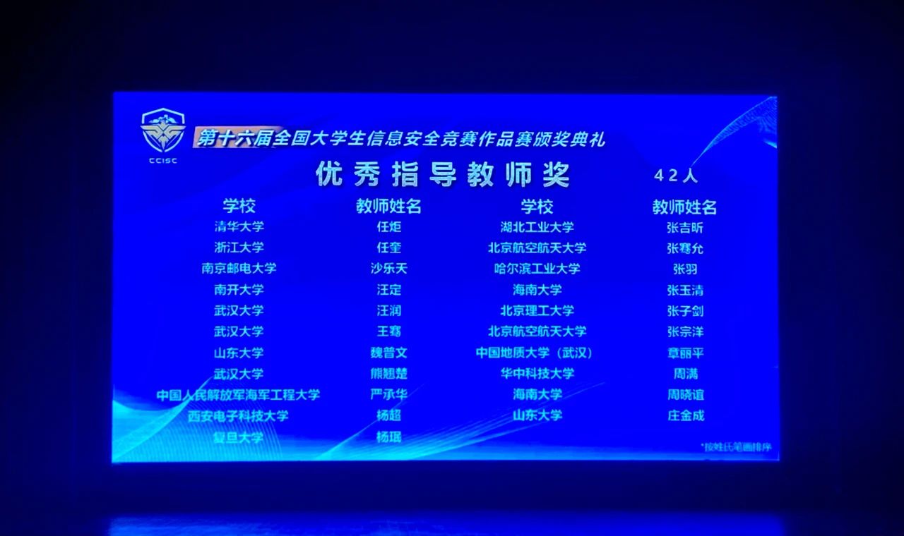 全国大学生信息安全竞赛是含金量很高的本科生国家级赛事之一。近年来该项赛事吸引了大量优秀本科生投入到信息安全作品的设计中,也涌现出了大批创新性的信息安全作品,极大推动了信息安全专业人才的培养。随着参赛队伍的逐年递增,该项大赛的竞争也越发激烈。面对众多来自985高校的竞争队伍,我们的队员稳扎稳打,做好了充足的准备,将近两年来的研究成果完美地呈现给了评委,取得了全国一等奖的佳绩,这也是对无数个日夜奋战辛勤付出的肯定和奖励。在整个赛事的准备和冲刺阶段,队员们坚持不懈,奋力拼搏,展现了地大计科学子坚韧不拔、勇攀高峰的风采。再次对获奖的同学们表示祝贺,祝愿大家在未来的学习中能勇往直前、再创佳绩!