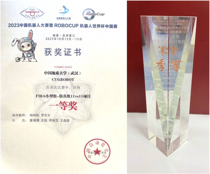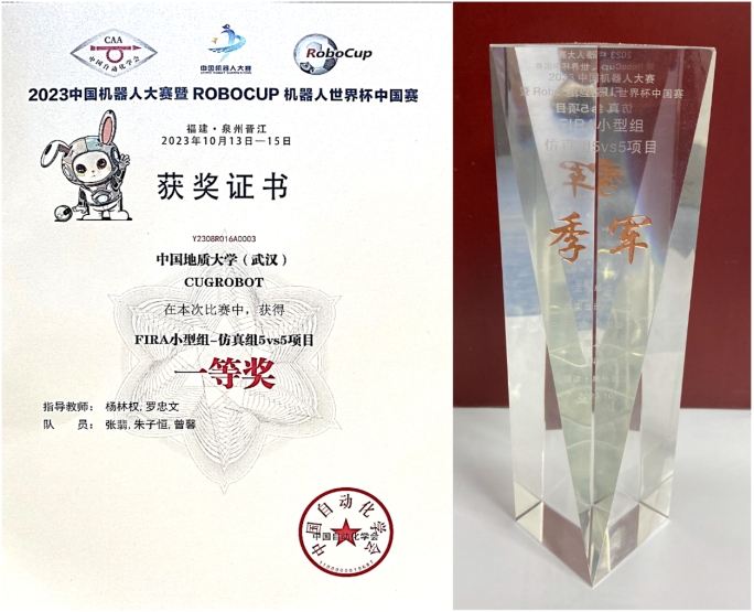 2023年中国机器人大赛暨RoboCup机器人世界杯中国赛(以下简称:中国机器人大赛)落下帷幕,万象城CUGROBOT代表队参加。经过激烈角逐,杨林权、罗忠文两位老师带领研究生张翡、夏倩倩和本科生朱子恒、王哲、曾馨、李婉雪、王晶鑫获得FIRA仿真组5vs5项目季军、一等奖,FIRA仿真组11vs11项目季军、一等奖。比赛过程历历在目,记忆犹新。