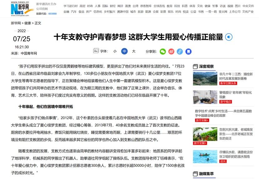 2022年7月,作为“夏心续梦”支教团首批十二名队员之一,郭鹏顺前往我校对口帮扶中学——云南省保山市施甸县第二完全中学,面向高三年级11个班级,共计500余名同学,开展为期15天的暑期大学生乡村支教活动。从数学、语文、英语、物理等基础课程与学习经验教授,到大学校园生活分享,从七十周年校庆主题宣讲到禁毒知识宣传,他结合自己的学习经历为那里的同学们带去对未来不一样的感受与希望。