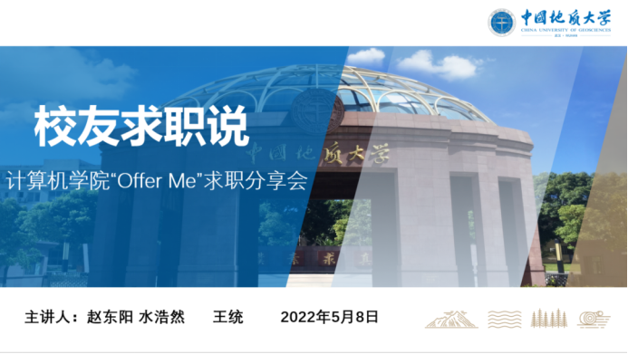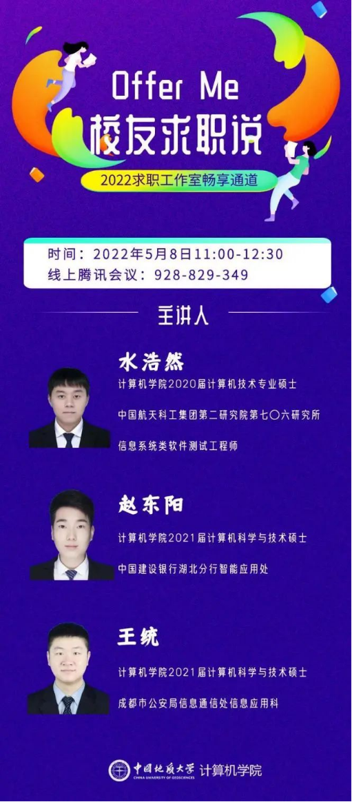 (通讯员:顾伟超)万象城awcsport官网“Offer Me”分享会之“校友求职说”专场活动于5月8日成功举行。本次活动邀请到3位来自不同行业的校友:2021届计算机科学与技术硕士专业毕业生赵东阳,目前就职于中国建设银行湖北分行;2020届计算机技术硕士专业毕业生水浩然,目前就职于中国航天科工集团第二研究院706所;2021届计算机科学与技术硕士专业毕业生王统,目前就职于成都市公安局,在线分享他们的职业选择、求职规划与工作感受。学院团委书记、研究生辅导员李欢欢,2019级辅导员闫维蓉以及200余名学生参与此次分享活动,李欢欢担任主持。