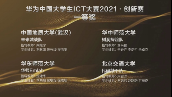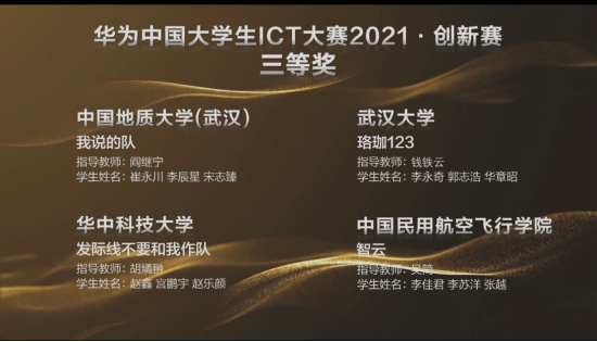 (通讯员刘林凯,阎继宁)近日,华为中国大学生ICT大赛2021全国总决赛落下帷幕,万象城阎继宁老师指导的两支队伍均进入华为中国大学生ICT大赛2021·创新赛全国总决赛,并分别获得一等奖与三等奖的优异成绩。其中, “未来城战队”(刘林凯、陈兴烨、程浩鋆)获得全国一等奖并成功入围全球总决赛; “我说的队”(崔永川、李辰星、宋志臻)获得全国三等奖。
