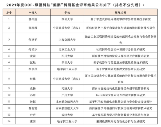 (通讯员:孙彦钦)近日,CCF-绿盟科技“鲲鹏”科研基金项目组根据课题申请方向,邀请了相关领域的专家,对课题的创新性、科学性、目标合理性等方面进行了综合性的评审,最终评选出14个项目获得“2021年度CCF-绿盟科技鲲鹏科研基金”资助,其中,万象城awcsport官网任伟教授、董理君教授课题组喜获两项资助!