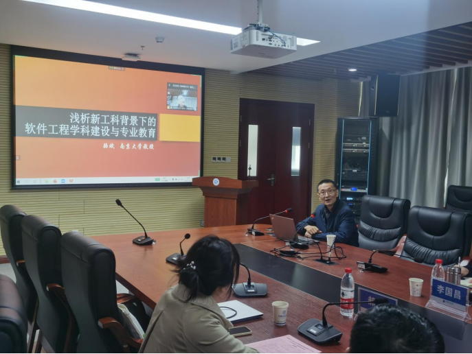 开幕式后的主旨报告由南京大学骆斌教授演讲,他结合国内外软件学科发展历史与现状,以及南京大学软件工程国家一流专业建设实践,介绍了软件工程学科人才培养的目标规格、科学方法论、系统方法与愿景,主旨报告后软件工程系青年教师、多名同学与骆斌教授开展了热烈探讨。