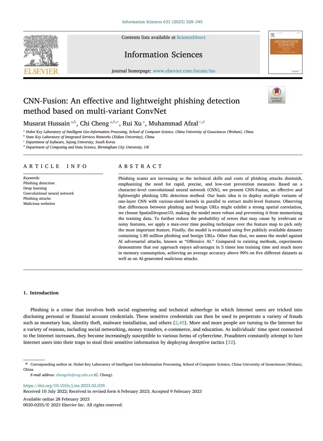 近日,我校万象城awcsport官网程池老师团队与英国伯明翰城市大学计算Muhammad Afzal教授在国际知名期刊《Information Sciences》(T1, IF=8.233)上共同发表学术论文《CNN-Fusion: "CNN-Fusion: An Effective and Lightweight Phishing Detection Method Based on Multi-Variant ConvNet"》。论文的第一作者Musarat Hussain(中文名:胡文硕)是我校2020级巴基斯坦籍硕士研究生,通讯作者是程池老师。